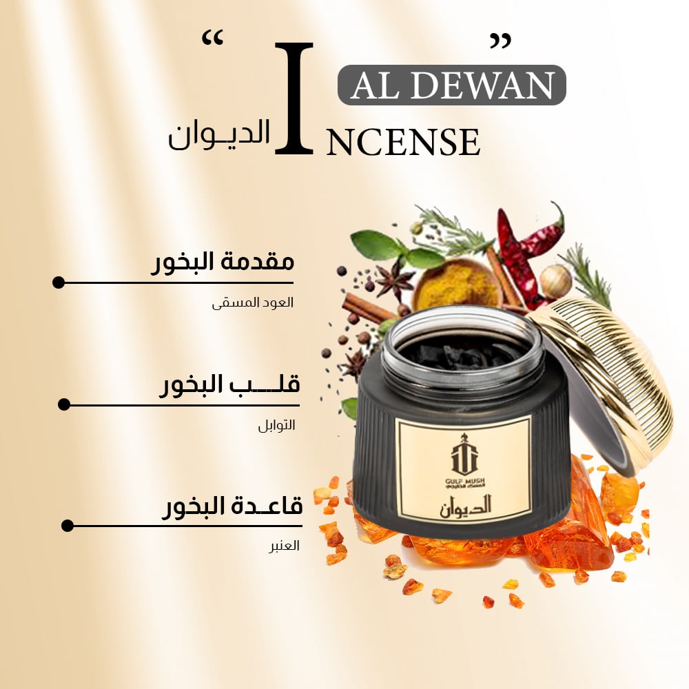 دخون الديوان يقدم تجربة عطرية شرقية فاخرة تجمع بين العود المسقى والتوابل الغنية ولمسات العنبر الدافئة ليملأ المكان برائحة مميزة تعكس القوة والأناقة وتضفي جوًا راقيًا ومريحًا في كل الأوقات.